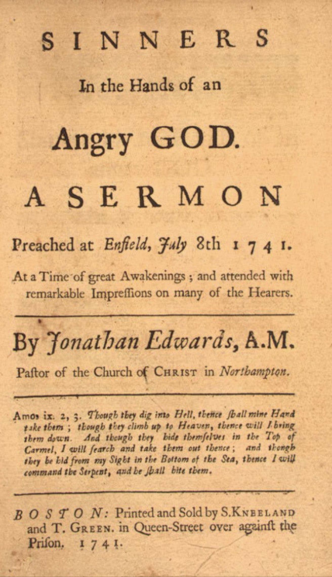 조나단 에드워즈의 '진노한 하나님의 손안에 있는 죄인들' 이 유명한 설교죠.