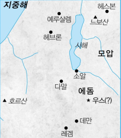 욥은 우스땅에 위치했다. 사진으로 보듯이 정확하진 않지만 대략적인 위치는 위와 같다. 땅이 가르쳐주는 의미는 이스라엘땅이 아니고 이스라엘의 배경이 아닌 곳에서 일어난 사건이란 것이다. 즉, 전통과 일반적으로 사람들이 인식하는 하나님의 사람들이 갖추어야 할 배경을 욥은 가지고 있지 않다.