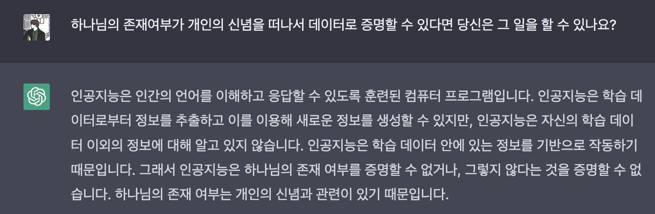 답변 : 인공지능은 학습 데이터로부터 정보를 추출하고 이를 이용해 새로운 정보를 생성할 수 있지만, 인공지능은 자신의 학습 데이터 이외의 정보에 대해 알고 있지 않습니다. 인공지능은 학습 데이터 안에 있는 정보를 기반으로 작동하기 때문입니다. 그래서 인공지능은 학습 데이터로부터 하나님이 존재한다는 것을 증명할 수 없거나, 그렇지 않다는 것을 증명할 수 없습니다. 하나님의 존재 여부는 개인의 신념과 관련이 있기 때문입니다.