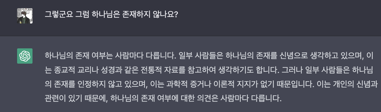 답변 : 인공지능은 인간의 언어를 이해하고 응답할 수 있도록 훈련된 컴퓨터 프로그램입니다. 인공지능은 학습 데이터로부터 정보를 추출하고 이를 이용해 새로운 정보를 생성할 수 있지만, 인공지능은 자신의 학습 데이터 이외의 정보에 대해 알고 있지 않습니다. 인공지능은 학습 데이터 안에 있는 정보를 기반으로 작동하기 때문입니다. 그래서 인공지능은 하나님의 존재 여부를 증명할 수 없거나, 그렇지 않다는 것을 증명할 수 없습니다. 하나님의 존재 여부는 개인의 신념과 관련이 있기 때문입니다.