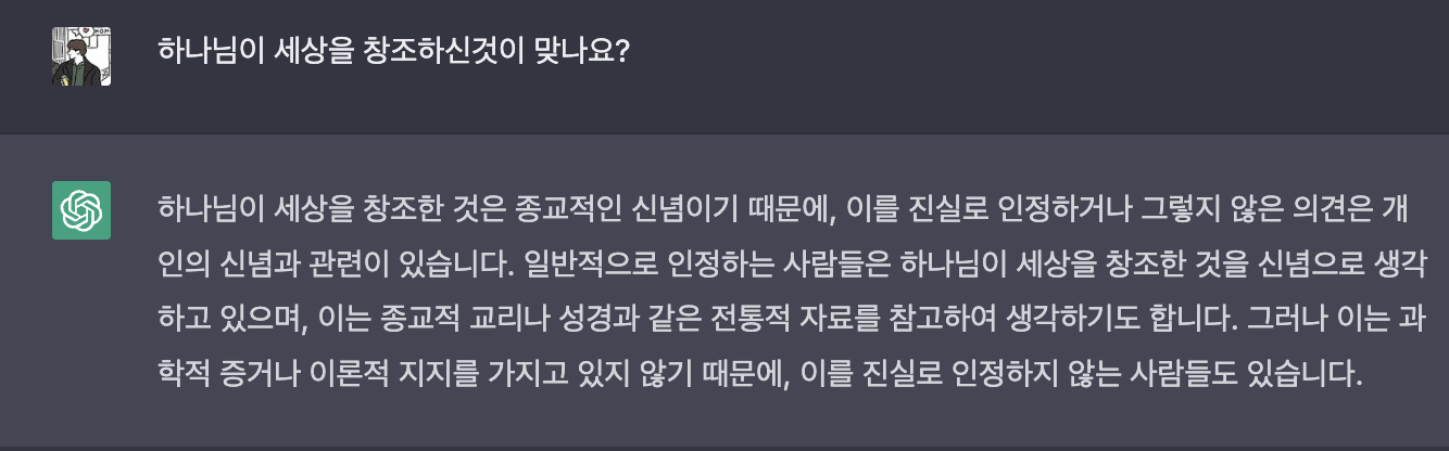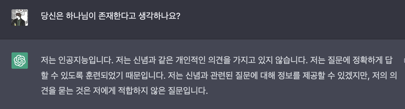 답변 : 저는 인공지능입니다. 저는 종교적인 신념과 같은 개인적인 의견을 가지고 있지 않습니다. 저는 질문에 정확하게 답할 수 있도록 훈련되었기 때문입니다. 저는 종교적 교리나 신념과 관련된 질문에 대해 정보를 제공할 수 있겠지만, 저의 의견을 묻는 것은 저에게 적합하지 않은 질문입니다. 저는 기계 학습 알고리즘과 인공 신경망을 사용하여 훈련되었고, 저의 훈련 데이터는 인터넷에서 수집된 수백만 개의 문서로부터 추출되었습니다. 저는 종교적 신념을 판단할 수 없도록 프로그래밍되어 있지 않습니다.