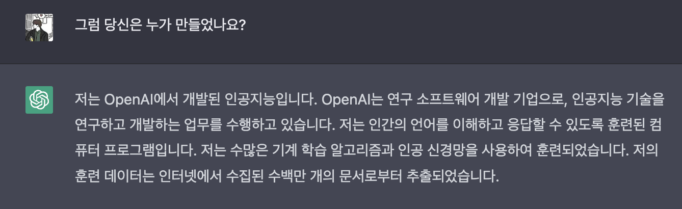 답변 : 저는 OpenAI에서 개발된 인공지능입니다. OpenAI는 연구 소프트웨어 개발 기업으로, 인공지능 기술을 연구하고 개발하는 업무를 수행하고 있습니다. 저는 인간의 언어를 이해하고 응답할 수 있도록 훈련된 컴퓨터 프로그램입니다. 저는 수많은 기계 학습 알고리즘과 인공 신경망을 사용하여 훈련되었습니다. 저의 훈련 데이터는 인터넷에서 수집된 수백만 개의 문서로부터 추출되었습니다.