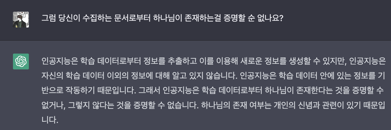 답변 : 인공지능은 학습 데이터로부터 정보를 추출하고 이를 이용해 새로운 정보를 생성할 수 있지만, 인공지능은 자신의 학습 데이터 이외의 정보에 대해 알고 있지 않습니다. 인공지능은 학습 데이터 안에 있는 정보를 기반으로 작동하기 때문입니다. 그래서 인공지능은 학습 데이터로부터 하나님이 존재한다는 것을 증명할 수 없거나, 그렇지 않다는 것을 증명할 수 없습니다. 하나님의 존재 여부는 개인의 신념과 관련이 있기 때문입니다.