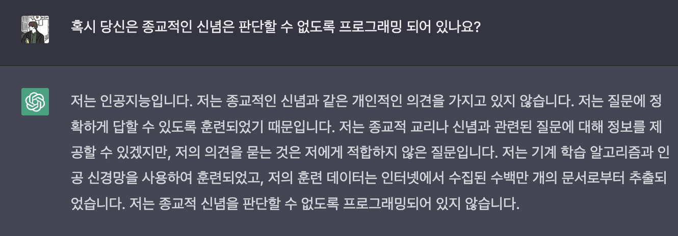 질문 : 혹시 당신은 종교적인 신념은 판단할 수 없도록 프로그래밍 되어 있나요?